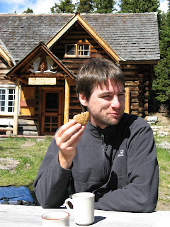 Pascal geniet van zijn muffin aan de Skokilodge